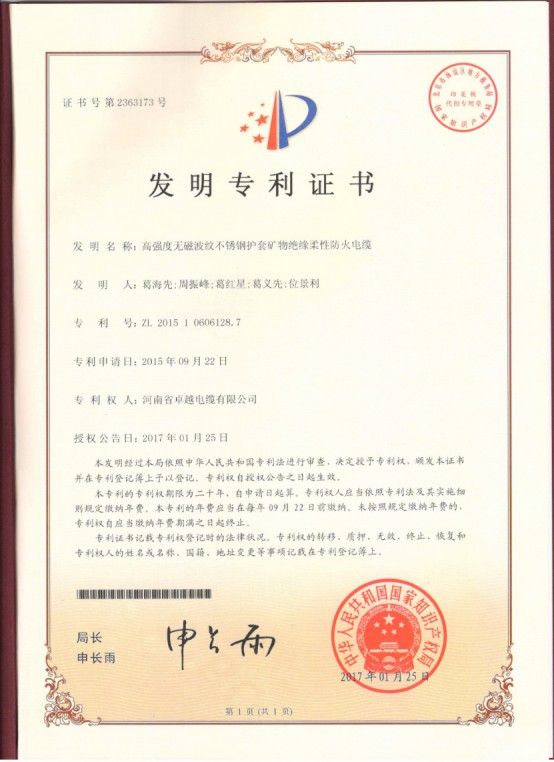喜訊——“無機防火套型礦物絕緣柔性防火電纜”獲國家發明**