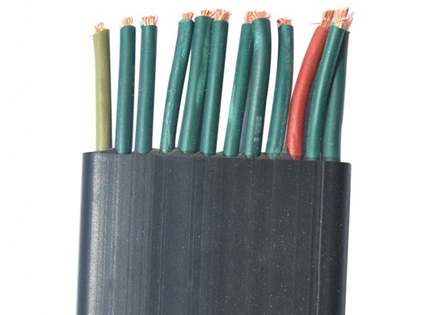 一、產(chǎn)品特點(diǎn)及用途 本產(chǎn)品具有耐寒、柔軟、耐磨、防油等特性,適用于交流額定電壓0.6KV/及下具有耐寒、防油等特殊要求的行車、臺(tái)車、傳輸機(jī)械等移動(dòng)電器用動(dòng)力傳輸線及控制、照明、通訊線路,本產(chǎn)品已廣泛用于冶金、電力、船舶、港口等行業(yè)?! 》窒嗥帘味‰姹馄诫娎|適用于作變頻器供電電纜?! 《?、使用特性 1.交流額定電壓:L。/U 0.6/1 KV *高工作溫度:105℃ *低環(huán)境溫度:固定敷設(shè)-40℃ 2.電纜安裝敷設(shè)溫度應(yīng)不低于-25℃ 三、基本型號(hào)及名稱 表1 四、代號(hào)名稱含義 表2 備注:阻燃型扁平電纜型號(hào)前加ZR,導(dǎo)體線芯中銅絲中可以采用鍍錫 五、主要技術(shù)指標(biāo) 1.成品電纜導(dǎo)體(R類)直流電阻《符合GB3956規(guī)定》 參照附錄A表1和表2?! ?. 20C時(shí)絕緣電丨阻不小于50C5/KM 3.成品電纜經(jīng)受交流50HZ3.5KV/min電壓試驗(yàn)不擊穿 六、基本電纜規(guī)格及結(jié)構(gòu)參數(shù) 注:YVFBP分相屏蔽電纜導(dǎo)體結(jié)構(gòu)及*大外徑參照上表數(shù)據(jù) 七、產(chǎn)品結(jié)構(gòu)示意圖